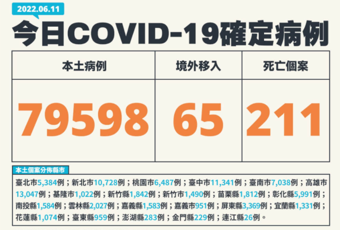 6月11日台灣新增79663例新冠確診病例,新增211例死亡。 (圖片來源:台流行疫情指揮中心)