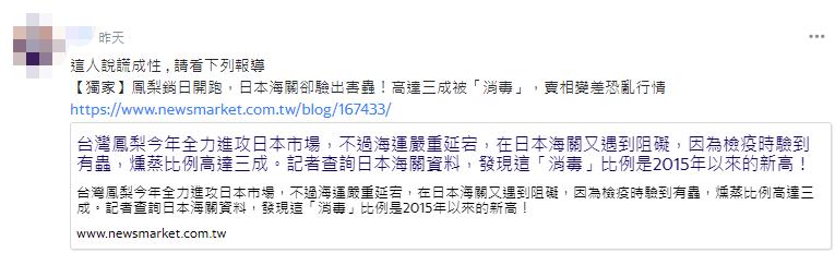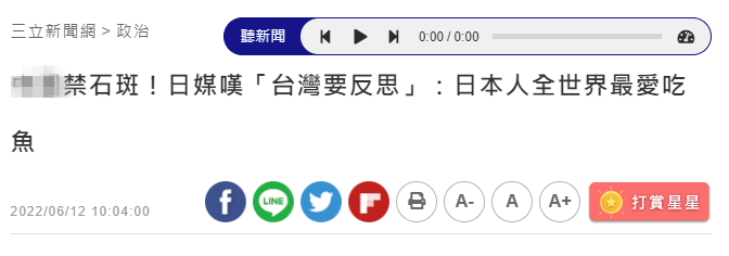 6月12日,台灣“三立新聞”、“自由時報”、“新頭殼”等不約而同集體炒作一則日本媒體人的個人言論——日本《產經新聞》台北支局長矢板明夫6月11日在臉書發帖,稱從台灣石斑魚檢出有害物質的說法,應該是“無稽之談”。理由是,台灣鳳梨被中國大陸暫停輸入,然後被大量轉銷到了日本,卻從沒聽說過在日本海關查出有問題。