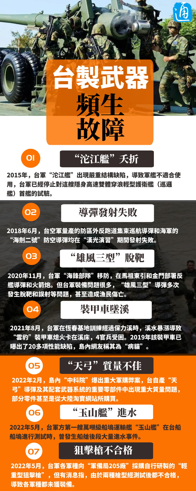 香港新聞網6月23日電 台軍意外不斷。近日,台陸軍58炮兵指揮部一輛雷霆2000火箭發射車,在屏東九鵬基地進行實彈射擊演習時,突然發生爆炸事件。 據資料顯示,雷霆2000多管火箭系統於1997年公開推出,是台軍參考各國現代化設計,自力研發的多管火箭炮。 台當局近年雖不斷叫囂艦艇等武器要“台造”,但從“雄風三型”脫靶到“玉山艦”進水,再到“天弓”導彈被曝部分零件不合格……台產武器質量實在堪憂。 台製武器近年出現哪些事故,戳圖了解!