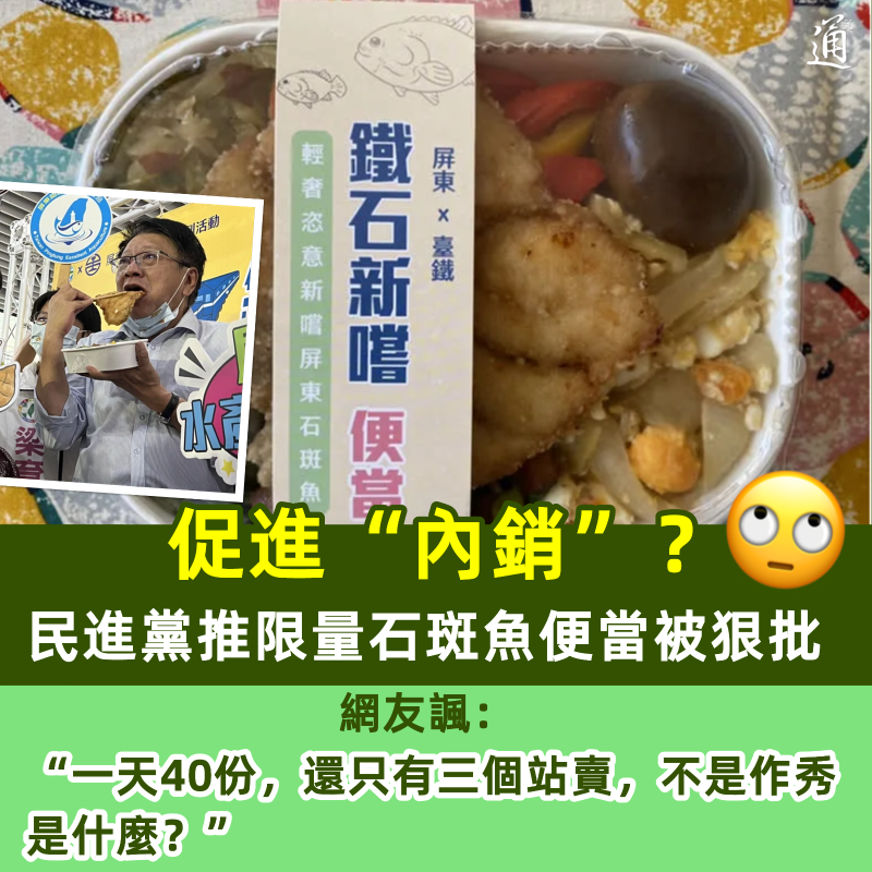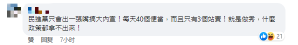 “每天40個便當,而且只有三個站賣!就是作秀,”有島內網友哀歎民進黨只會出一張嘴搞大內宣,解決政策卻拿不出來。