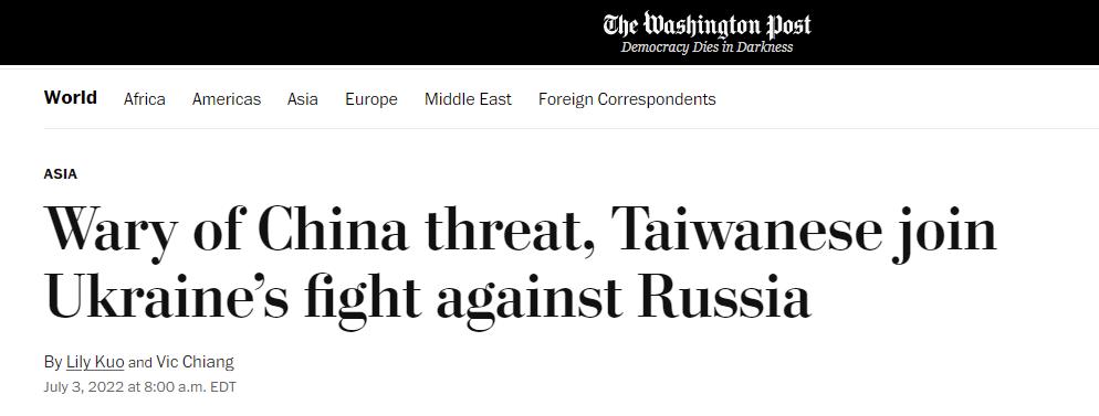(美國《華盛頓郵報》報道) 美國《華盛頓郵報》7月3日發表一篇題為“憂心中國威脅,台灣人加入烏克蘭抗俄作戰”的報道,講述多名台灣人在烏克蘭前線打仗的故事。報道稱,目前尚不清楚究竟有多少台灣人赴烏“幫忙”,但受訪者指約有10人。 該報道稱,這10人中就有來自台灣桃園的導遊莊育瑋(Chuang Yu-wei,譯音)。他接受採訪時,在台灣問題上煽風點火,揚言幫助烏克蘭等於“替台灣爭取時間”,所以在烏克蘭總統籌組“國際軍團”的隔天就報名參加,還說什麼“台灣不能只當個巨嬰”,“你若想要別人幫你,必須先伸出援手”。 俄烏軍事衝突爆發後,台灣民進黨當局配合美西方輿論,炒作稱“對烏克蘭感同身受”。《華盛頓郵報》稱,台灣之所以對烏克蘭“感同身受”,是因為台灣也面對相似處境,赴烏台籍志願兵就藉機向外國士兵講述台灣處境。 報道引述27歲台灣青年陳廷偉(Chen Ting-wei,譯音)指,當他向其他外國士兵表明來自台灣時,大家都承諾,如果台灣有需要,會來協助台灣,“來自波蘭、美國、澳洲、巴西及烏克蘭的人都跟我說,如果中國(大陸)攻打台灣,‘我們會在台灣見’。” 這句“台灣見”讓台媒又嗨了。台灣“中央社”在報道標題中高調寫道:“受台籍志願兵援烏感召 多國士兵稱願支援台灣”。