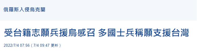 香港新聞網7月4日電 日前,台灣“中央社”大篇幅報道美國《華盛頓郵報》一篇採訪多名烏克蘭前線台籍志願兵的文章,並稱當有人表明“台灣人”身份時,外國士兵都承諾“支援台灣”,“若中國(大陸)攻打台灣,‘我們台灣見’”。對此,有島內網友怒斥報道“唯恐天下不亂”、“希望台灣趕快打仗嗎”,還有網友認為,這是民進黨看選舉臨近,所以開始炮製各種“抗中保台”新聞。