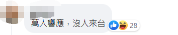 “萬人響應,沒人來台”。有人則引用台灣論壇PTT用語“萬人響應,一人到場”諷刺道:外國士兵嘴上說得好聽,但若真打起來就是“關我何事”。