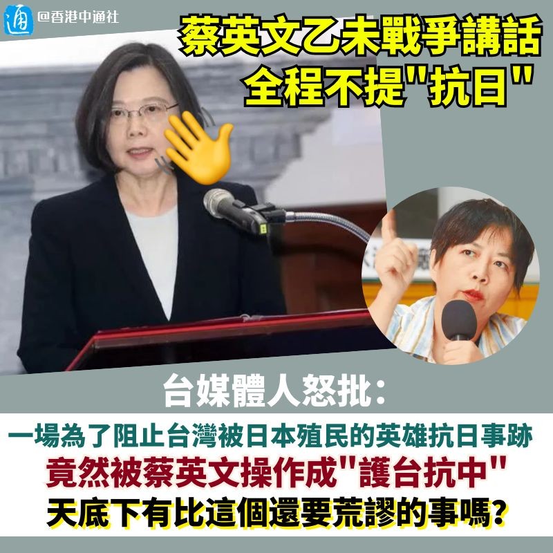 香港中通社製圖 乙未戰爭指的是中日甲午戰爭後清朝於公元1895年(農曆乙未年)被迫將台灣割讓給日本時,所發生的一連串台灣人民反抗日本統治的大小戰役的總稱。據統計,日軍有515人負傷、164人戰死,另有數千日軍感染霍亂等疾病而死。而台方死傷人數至少有1.4萬人。 可見,乙未戰爭明明是一場抗日戰爭,但蔡英文致辭時卻絕口不提“抗日”二字,引發島內強烈不滿。 台媒體人黃智賢今日(4日)在社交媒體發文,批評蔡英文此舉極其荒謬! 她指出,一場為了阻止台灣被日本殖民的英雄抗日事跡,竟然被蔡英文操作成“護台抗中”,天底下有比這個還要荒謬的事嗎?