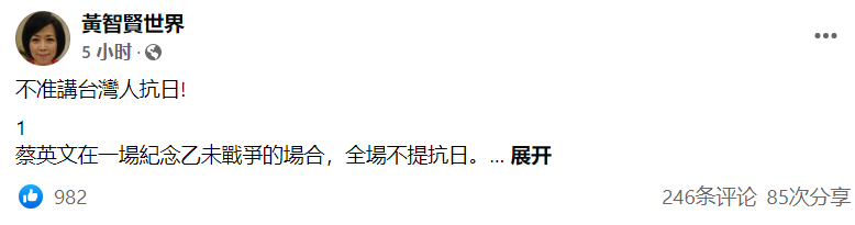 社交媒體截圖 黃智賢指出,長久以來在美日勢力的操縱下,台灣民眾被“洗腦”,從歷史、語言到血統,台灣與大陸關係不斷被割裂。早些年,島內宣傳“是中國大陸自己不要台灣”,卻不說那是甲午戰爭清廷戰敗後,被迫割地賠款;還把日本從“侵略者”美化為“善良博愛的統治者”。種種洗腦劣行在前,“如今蔡英文在台灣人血淚抗日的紀念會上,幫日本扭曲轉移屠殺台灣人的血腥事實,有什麼好奇怪?” 黃智賢提醒,對美日來說,洗腦台灣人“反中親日”不僅可以收割政治上的利益,更能達到經濟與商業的壟斷。看看如今“台灣的外貿,經濟命脈,關鍵零件,通路,品牌,產業鏈,甚至企業控股,是不是日本控制?” 黃智賢感歎,日本用盡各種手段操控台灣政治和輿論,但台灣人被“割韭菜”的同時還幫忙“數錢”! 她舉例稱,日本人不願意吃的福島食品,台灣人要努力吃;日本把核污水傾倒入太平洋,台灣要支持;日本驅趕台灣漁船,台灣也要假裝忘記。 “日本在台灣賺得盆滿缽滿,台灣政客毫不猶豫為日本利益奮鬥,誰在乎乙未抗日呢?”黃智賢諷刺。 台灣網友也紛紛嘲諷,“在她(蔡英文)心里,美日是絕對不能冒犯的,必須無條件供奉”,“最可憐可笑可悲的就是台灣人了,台灣人用自己血肉之軀抗日,到頭來還要被操作成‘抗中護台’?”