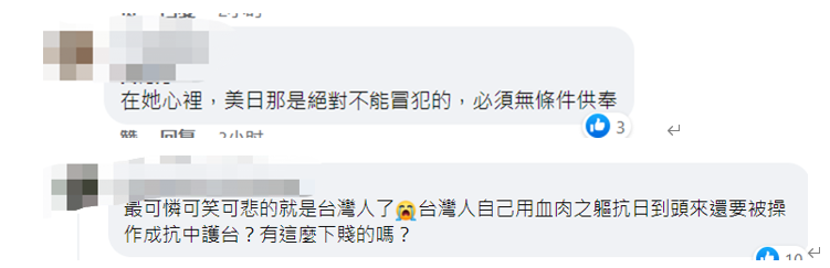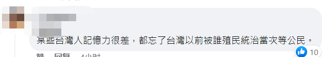 網友評論 也有網友提醒台民眾勿在政治操弄下遺忘歷史——“忘了台灣以前被誰殖民統治當次等公民。”