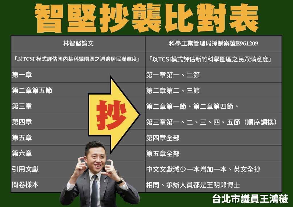 國民黨台北市議員王鴻薇指控林智堅在中華大學發表的碩士論文涉嫌抄襲。(圖:王鴻薇辦公室) 據台媒報導,林智堅被控在“中華大學”、“台大國發所”的碩士論文都涉嫌抄襲,他雖召開記者會作出澄清,但外界仍有諸多疑點,質疑按照林智堅回應,其在“中華大學”發表的碩士論文,則可能涉及“自我抄襲”。 台媒報導稱,日前,林智堅遭國民黨台北市議員王鴻薇爆料,其2008年在“中華大學”發表的碩士論文,涉嫌抄襲同年6月“竹科管理局”的研究報告,不僅內容、排版順序、參考文獻幾乎雷同,甚至連錯字都一樣。 對此,林智堅於7月6日接受媒體採訪時表示,“自我抄襲”這個說法很奇怪,並再一次提到,他有參與竹科研究的討論,認為他自己寫的東西,自己拿來引用,這有什麼地方不恰當? 此言論一出,台灣網友紛紛表示“傻眼”: “這種狡辯邏輯我還是第一次聽過。” “完了,根本自表,他不知道(學術)有‘自我抄襲’這事嗎?” “連錯字也引用?” “你引用也太多了吧?” “問題是你好像也沒(寫)引用”……