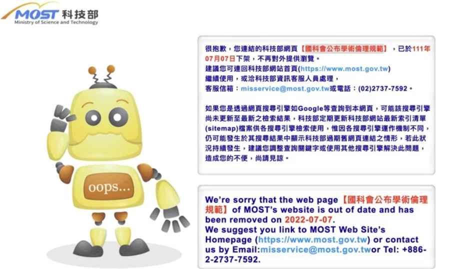 台當局科技部門“國科會公佈學術倫理規範”網頁一度下架。(截圖) 然而,更讓人看不懂的,還有台當局科技部門的操作。 7月7日下午,台當局科技部門突然將“國科會公佈學術倫理規範”網頁下架,且顯示“不再對外提供瀏覽”,引起外界質疑: “為了救林智堅一個人,民進黨直接不演了?” “要重新定義何謂學術倫理?” “此地無銀三百兩?”…… 最終,在網頁“消失”超過半小時後,又突然恢復運作了。 無獨有偶,“台灣學術倫理資源教育中心”也貼出公告,宣佈7月8日中心客服暫停服務一天。