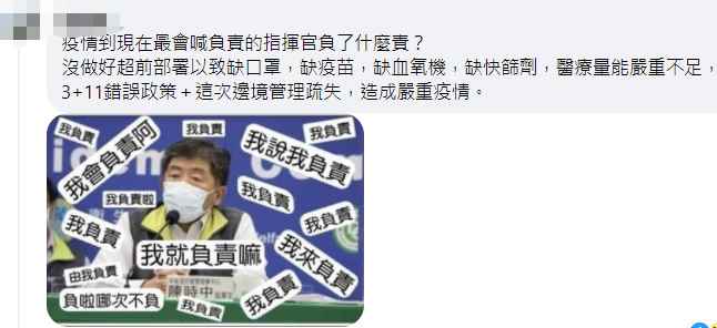 更有台灣網友對陳時中的聲明進行了PS(修圖軟體修改),諷刺他在防疫時確實喊“我負責”,但實際上卻是: 讓求助無門的北漂確診學生自己照顧自己; 要染疫民眾等隔離通知期間“自主應變”; “3+4”新制上路亂象叢生,陳時中竟稱“要怪就怪病毒”; 民眾擔憂台產疫苗追打會出事,陳時中甩鍋“我無法負責”…… 在回顧完陳時中此前是怎樣“負責”後,這位台灣網友不禁發出疑問:台北市民們,你們真的相信他會扛責嗎?