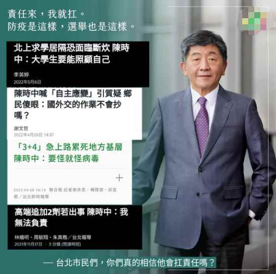 (截圖:陳時中官方臉書粉專) 據台媒報道,民進黨昨日(7月10日)下午召開“選舉對策委員會”,建議徵召台當局衛生福利部門負責人陳時中為台北市長候選人,而陳時中似乎早有準備,當晚便以“政治候選人”身份開設了臉書粉專及媒體群組,並發表“責任來,我就扛,防疫是這樣,選舉也是這樣”的聲明,表示願意接受徵召。 除了喊出“責任來,我就扛”,陳時中在聲明中也提到,台北這個城市是他的家,生在這裡、長在這裡、也住在這裡,並強調“也知道這個城市的發展已經停滯太久”,要大家跟他一起,為台北的未來打贏這一仗。 但值得注意的是,新冠疫情暴發以來,陳時中身為台灣地區抗疫指揮官,曾多次公開喊出“我負責”3個字。 譬如2021年的機組員檢疫“3+11”(居家檢疫3日,自主健康管理11日)規定,被質疑是防疫破口,而陳時中在不到兩個月時間內,三度表示“我負責”、“我已經負責”、“我會負起最後責任”;結果到現在什麼都沒做,還跑去參選台北市長,證明這不過只是一句口號而已。 因此,陳時中這篇“參選聲明”一發佈,就引來大批台灣網友炮轟:“疫情到現在,最會喊‘負責’的你負了什麼責任?”、“只會出一張嘴,什麼也沒扛!”、“我負責,完整翻譯是,我負責選市長。”