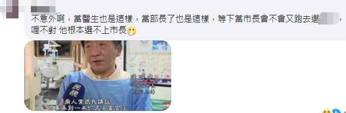 還有台灣網友貼圖表示,並不意外陳時中辭職防疫指揮官去選市長,因為他之前當醫生、要選衛生福利部門負責人時也是這樣的。 這位網友發佈的一段新聞採訪視頻截圖顯示,2017年陳時中在牙醫診所受訪時,自己就提到:“病人常跟我說,不要弄到一半你又去當官了……”