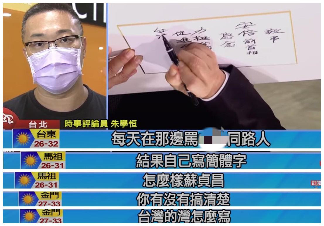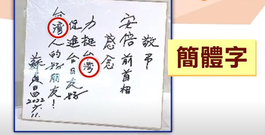 在確定參選台北市長後,這是陳時中的首個行程,原本是想借機增加曝光率,不料卻發生此等糗事! 蘇貞昌這邊更誇張。他在追思留言板上寫到“台灣”時,“灣”字用的竟然是簡體字。有台灣時事評論員批道,“每天都在那邊罵大陸,結果自己寫簡體字!”