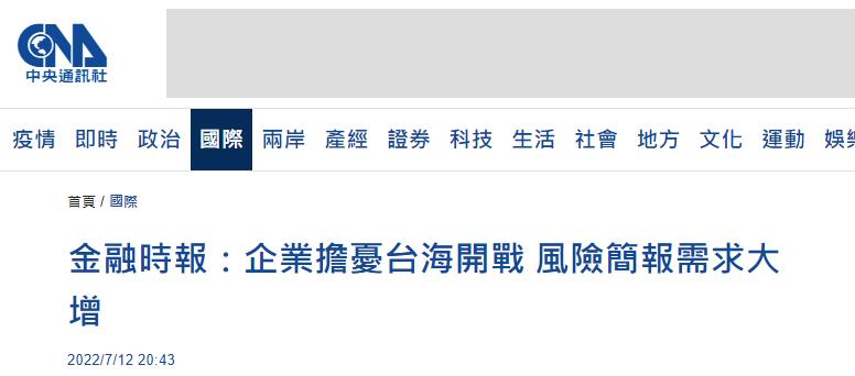 (台媒報道截圖) 據台灣“中央社”、“自由時報”、“聯合報”報道,英國《金融時報》(FT)7月12日報道稱,俄烏軍事衝突爆發後,歐美企業高層對於台灣的詢問度“暴增”,“愈來愈關切台灣是否可能發生戰爭”。 這篇報道引述了幾家美國戰略顧問公司負責人的說法。 其中一家公司負責人宣稱,一年前該公司偶爾一、兩次被客戶詢問有關台灣的問題,現在則被要求直接就台灣的政治和軍事情勢向客戶執行長做簡報,並且舉辦與美國高官或退役將領的會議,瞭解他們對台海局勢的看法。 據報道,該公司還被要求就2024年“台灣大選”製作相關簡報,甚至有企業希望他們安排兵棋推演,以協助企業高層瞭解台海情勢並思考應變計劃。 另有一家公司則特別提到,有7家財星美國500強(Fortune 500)的企業,請求幫忙規劃應變方案,包括必要時如何從台灣撤離員工。 但值得注意的是,報道中提到的這幾家公司的負責人,他們身份並不簡單,有前美國印太司令部司令顧問塞耶茲(Eric Sayers)、前美國駐港澳總領事唐偉康(Kurt Tong),以及一名前美國中央情報局(CIA)中國分析家,一名退役的美國陸軍“綠色貝雷帽”特種部隊成員。 而近一段時間以來,為了遏制中國大陸發展,美國政客多次在公開場合藉俄烏局勢炒作台灣議題,渲染所謂中國大陸“軍事威脅”。 與此同時,台灣民進黨當局內部也帶風向稱“對烏克蘭情勢感同身受”,煽動“抗中保台”。 因此,對於這次台媒炒作“台灣有事,外企也會有事”,不少島內民眾並不買賬,認為台灣民進黨又在迎合美國兜售“芒果乾”(諧音:亡國感): “天下本無事,是民進黨找事!” “越到選舉越有事,惹事的盡是些政治人物!” “美國不要挑釁(台海)就不會有事……”