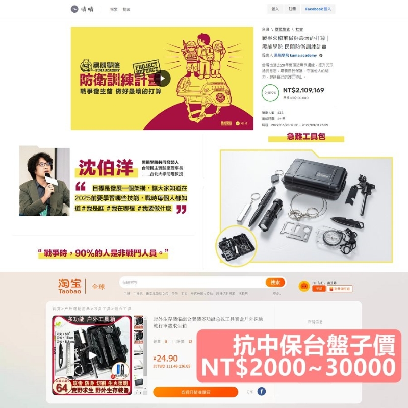 圖自黃士修臉書賬號 沈伯洋向來熱衷於炒作大陸對台灣進行“認知作戰”,宣揚“抗中保台”,傳播對立情緒,也因此得到綠營和綠媒的青睞,頻頻以專家身份在媒體上曝光,賺取流量。 嚐到“反中”的甜頭後,沈伯洋開始“流量變現”。沈伯洋近年創立了一所名為“黑熊學院”的教育機構。據悉,這個教育機構大有來頭,其網站資料顯示,島內防務部門轄下“國防安全研究院”的“國安所所長”沈明室和“國防戰略與資源研究所所長”蘇紫雲都曾親自為其背書推薦。 該教育機構宣稱為了“反中保台”,民防動員刻不容緩,并由此推出軍事知識、民間防衛、情報通訊等課程。 有信眾甚至大贊專業,“台軍的新訓課程應該外包給你們才對!” 不過,賣課割韭菜已經不能滿足沈伯洋了。6月28日,沈伯洋又通過“黑熊學院”發起名為“防衛訓練計劃”的募資計劃。該計劃以“抗中保台”之名推出急難工具包、主題T恤衫、臂章、貼紙等商品,套餐價格由1000至30000元不等。 至今,網站數據顯示已有6百多人購買過,涉及金額超過2百萬元。 就在沈伯洋“袋袋平安”時,島內論壇PTT有網民7月9日爆料稱,自己通過以圖搜圖功能,發現這個募資計劃出售的急難工具包竟然跟淘寶商品一個樣,而淘寶同款價格僅需58元人民幣,約合257元。 該網民進一步咨詢淘寶商家後發現,若訂1千套還能打個折,單價降至209元。 而據沈伯洋募資網站價格,一個急難工具包、一件T恤、一個臂章、一組貼紙要價高達2000元。 事件曝光後,島內網民直呼“智商稅”! 昨日(13日),“核能流言終結者”組織創辦人黃士修轉載爆料時稱,他甚至在淘寶找到特價24.5元人民幣(約合109元)的淘寶同款。 黃士修表示,這幾年,沈伯洋頂著資訊戰專家的頭銜招搖撞騙,他成立的民主實驗室就是民進黨認知作戰中心之一,整天喊“中共認知作戰”。 黃士修又指,沈伯洋搞的這個“黑熊學院”就是方便跟著民進黨一起割韭菜。他感嘆,“台獨”真慘,老的要被民進黨當局詐騙,小的要被“台獨”募資詐騙,智商稅從小繳到大,可憐呐。 經黃士修轉載後,事件進一步發酵。就在今早,沈伯洋的募資網站突然顯示無法訪問。