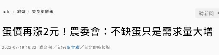 (台灣“聯合報”截圖) 近期台灣又鬧“蛋荒”,台北蛋商工會日前表示,目前粗估每天雞蛋缺口達100萬顆以上,“嚴重程度跟春節期間不相上下”,所以自7月20日起,雞蛋每台斤再漲2元,產地價漲到42.5元,批發價則漲到52元,創下歷史新高。 而這,也是今年春節前後台灣鬧“蛋荒”以來第四度調高蛋價,每次2元,預料下游的市場零售價將漲得更多。 據悉,蛋商公會宣佈調漲消息後,台灣攤商就換上最新價格,白蛋為52元,紅蛋為58元,讓不少民眾直呼吃不消。 有攤商透露,雞蛋單價漲到50元後,有感覺到民眾比較少買,“客人來買都嫌貴!”