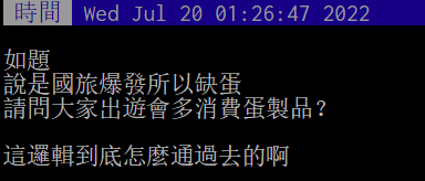 香港新聞網7月21日電 台灣“蛋荒”未解,蛋價卻又調漲!近日,台北蛋商公會宣佈,雞蛋價格每台斤再漲2元(新台幣,下同),破島內蛋價歷史新高,而漲價的原因就是“缺蛋”。 不過,台當局農業部門對此依然是連聲否認,宣稱“台灣不缺蛋只是需求大增”,並將問題甩給“暑假出遊人多”,稱雞蛋需求大增,才造成價格上漲…… 如此“清新脫俗”的理由,立即引來台灣民眾吐槽,有人直言這跟台當局灌輸“台灣不缺電只是供電不足”一樣,質疑是“在辦造句比賽?”有人則反問“難道往年暑假沒有出遊潮嗎?”