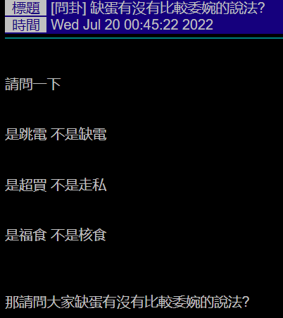 更有台灣網友發出靈魂一問,“‘缺蛋’有沒有比較委婉的說法?”諷刺台當局一遇事就喜歡靠“創新詞”轉移視線,譬如是“跳電”不是“缺電”,是“超買”不是“走私”,是“福食”不是“核食”。