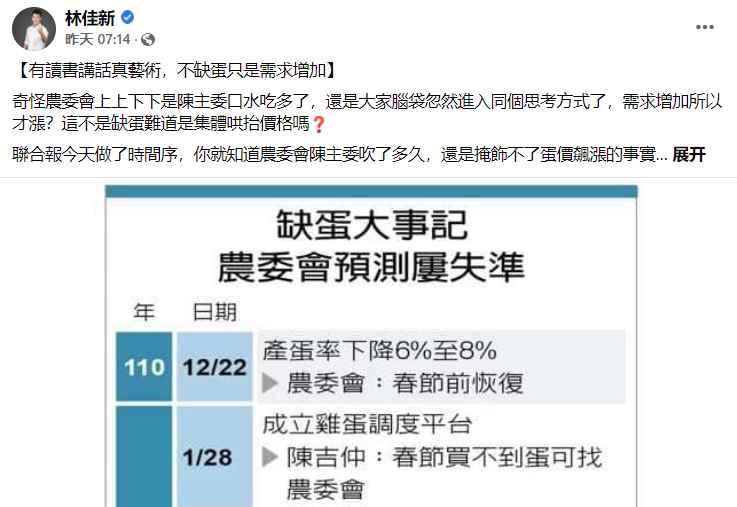 據報導,自2021年年底,台灣開始出現“缺蛋危機”,當時台當局農業部門信誓旦旦稱“過年不缺蛋”、“買不到找農業部門”,結果春節後還是缺蛋,這才手忙腳亂推出一系列應對措施,包括調漲蛋價、撒錢補貼蛋農,以及從有禽流感疫情的日本高價進口雞蛋,並一次又一次掛保證“3月中解蛋荒”、“4月供需已近正常”。 然而,4月還未過完,台灣在4月20日又因“蛋荒”調漲蛋價…… 對此,台灣“網紅菜農”林佳新7月20日在臉書發帖表示,在他看來“蛋荒”不可能緩解,只是時空背景不同,出面解釋的人再換一個,理由再換一個就好。而無論那些官員怎麼說,都掩蓋不了蛋價飆漲的事實。 林佳新亦對“暑假出遊人多所以需求大增”說法表示質疑,反問“難道往年暑假沒有出遊潮嗎?”貼文還帶上標籤“疫情影響所以大家出遊都努力吃蛋”。