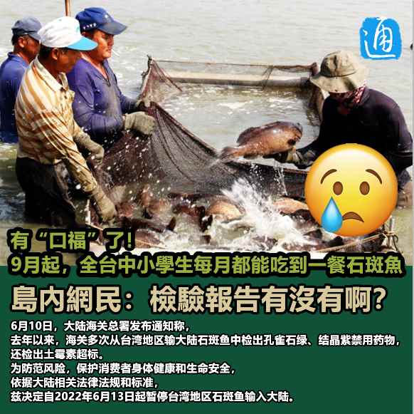香港新聞網製圖 據台媒報道,台灣教育主管部門負責人潘文忠21日宣佈,台灣“教育部”與“農委會”合作,9月至年底,全台灣中小學生的營養午餐中,每月都有一餐能吃到石斑魚。 潘文忠說,全台灣偏鄉(注:地處偏遠且交通不便的學校)有1312所,學生人數約有24萬人,過去運送、廚工成本占掉餐費,台灣行政主管部門負責人蘇貞昌同意加碼12元(注:新台幣,下同),讓每餐可達到62元;另外9月至年底,全台灣中小學生每月都有一餐能吃到石斑魚,總經費約6億元,是由台灣行政主管部門額外支應。 潘文忠補充道,台灣農產品很優質,受到“政治不當干預”,不會為了消化農產品,才採用這措施。他還著重強調“石斑魚對很多孩子來說,不見得有機會吃到”。 台灣教育主管部門指出,除了經費補助外,也提供兼具防污及透氣效果的廚工服裝,但是並未提及石斑魚有無檢驗報告。 台灣行政主管部門發言人羅秉成一方面指石斑魚受大陸“打壓”,對農漁民不公,另一方面又強調學生的營養午餐要吃到石斑魚不容易,該魚屬於價格較貴又優質的產品,因此將石斑魚納入營養午餐,是“兩全其美”的做法。 6月10日,大陸海關總署發佈通知稱,去年以來,海關多次從台灣地區輸大陸石斑魚中檢出孔雀石綠、結晶紫禁用藥物,還檢出土黴素超標。為防範風險,保護消費者身體健康和生命安全,依據大陸相關法律法規和標準,茲決定自2022年6月13日起暫停台灣地區石斑魚輸入大陸。 孔雀石綠在台灣也是“動物用禁藥”,但大陸發佈該通知後,台當局不僅不反思食品安全問題,反而頻繁炒作相關議題,台灣地區領導人蔡英文還宣稱大陸“片面傷害兩岸關係”,島內相關部門還借機呼籲民眾“掏錢挺石斑”,但由於石斑魚單價過高、不好處理,還有禁藥,有島內民眾直言:“實在買不下去。” 台當局除了呼籲民眾多吃石斑魚,還讓台軍“買單”解決石斑魚滯銷問題,曾有參與街頭民調的台灣年輕人表示,“台軍就很衰,一直吃滯銷的東西,我覺得蔡英文應該檢討一下”。 這次,台灣石斑魚將被納入營養午餐的消息引發一片熱議,大批島內網民直言:“石斑魚的檢驗報告一定要有,不合格的食物都不應該給民眾吃。”有網民斥責:“毒害台灣幼苗。”還有網民諷刺道:“再搭配午餐水果,例如鳳梨、釋迦。” 【編輯:胡雪石】