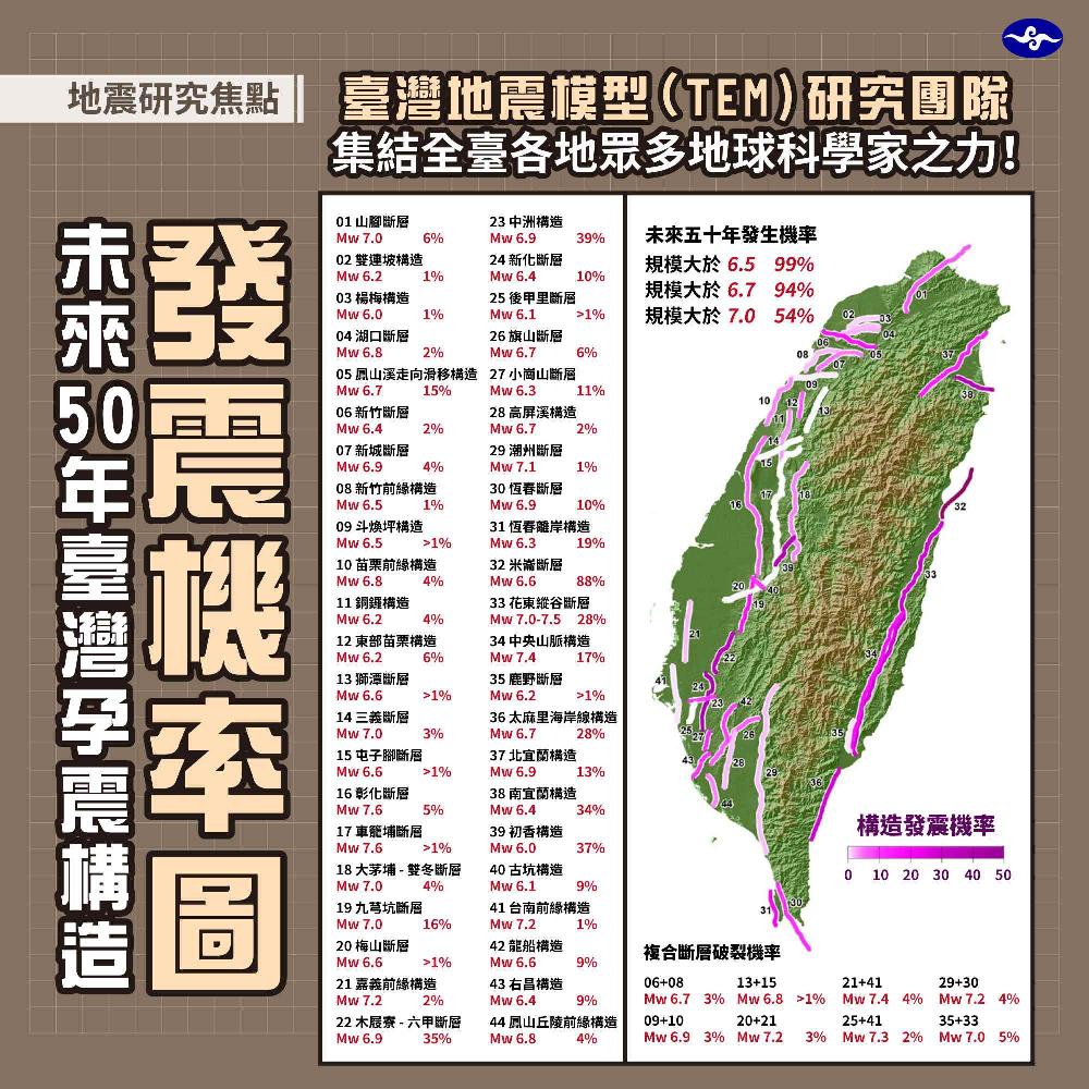 台氣象部門:50年內發生規模7以上地震概率逾5成分享到: