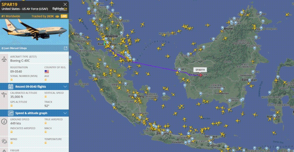 香港新聞網8月2日電 台媒報道,根據全球航班追蹤網站Flightradar24信息,美國眾議院議長佩洛西搭乘的波音C-40C運輸機(呼號SPAR19)2日下午已從馬來西亞雪邦機場起飛,預計晚間21時30分抵達台北松山機場。