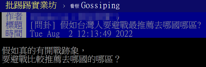 網友評論 隨著島內不斷渲染佩洛西訪台,中國人民解放軍東部戰區今日(2日)在微博上發文,“重磅發布:嚴陣以待,聽令而戰”,昨天就有兩艘導彈護衛艦與一艘測量艦,穿過與那國島海域由北南下,向台灣東部海域航行。 有關警告傳回台灣後,島內網友坐不住了!怕被佩洛西殃及的台網友忍不住在論壇發帖詢問,若兩岸“開戰”,躲去哪裡比較安全?