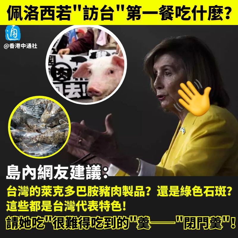香港新聞網8月2日電 島內媒體密集炒作美國眾議院議長佩洛西可能於今晚(2日)抵達台灣,對於佩洛西不顧台灣民眾安危,只想著自己政治利益的舉動,有島內網友提議要拿美國萊豬(含“瘦肉精”的豬肉)招待佩洛西,也有人憂心忡忡地問,該去哪裡避難? 台灣綠媒引述消息稱,佩洛西將於今晚10點20分抵台,會留宿一晚,下榻台灣中山區或信義區的飯店,料她3日下午搭機離台。台灣地區立法機構國民黨黨團總召集人曾銘宗2日透露,他已收到通知,若佩洛西抵台,將於8月3日上午前往台立法機構。 島內媒體就此發起討論:“佩洛西來台第一餐要請她吃什麼?”有網友神回覆:“台灣的萊克多巴胺豬肉製品?還是綠色石斑(指含有孔雀綠等禁藥的石斑魚)?這些都是台灣代表特色。”