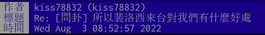 (新華社發布的軍演範圍圖) 對此,解放軍加大演習力度。據新華社8月2日晚報道,解放軍將於8月4日12時至7日12時,在台灣東西南北周邊共6個海域,進行重要軍事演訓行動,並組織實彈射擊。而在此前,解放軍已在台海、南海、東海舉行多場軍事演習。 除了軍事行動外,中國大陸也展開限制台灣的經濟活動,包括暫停台灣地區100多家食品輸入,暫停台灣地區柑橘类水果和冰鲜白带鱼、冻竹荚鱼输入;同時,中國商務部決定,暫停天然砂對台灣地區出口。 這一系列消息,立即引起島內輿論的關注。 在台灣PPT論壇上,有台灣網友就問,佩洛西雖說要來“保護台灣”,但若不來好像也沒差,來了反而演習、制裁樣樣來,“所以佩洛西來台對我們有什麼好處?”