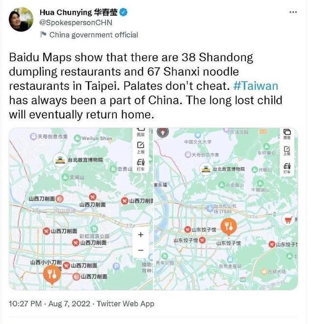 (社交網站截圖) “百度地圖顯示,台北市共有山東餃子館38家、山西麵館67家。味覺不會騙人。台灣一直是中國的一部分。失散多年的孩子終將回家。”華春瑩在推文中說。她用的配圖是地圖軟件的兩張截圖,圖中山西刀削麵、山東餃子館星羅棋佈。 網友發現,台灣省街道的名稱有很多熟悉的詞兒——廣州街、長沙街、南京路、重慶路,等等。有網友直呼,“破防了,都是大陸城市的名字”;還有網友戲稱想看“夢幻聯動”:天津有一條“台灣路”,不知台灣是不是也有一條“天津路”? 很快,網友發現了新亮點,在一張標示“南京東路”的台灣省地圖上,“小統一牛排”、“張家麵館”等餐飲店名赫然在列,“山西刀削麵”更是站上了圖中“C位”。 很多網友表示,“想去台灣省吃山西刀削麵”。隨後,在台灣省地圖上搜索“山西刀削麵”的網友暴增,一度把地圖軟件“搜崩”了。 一家被網友“點名”的高雄市的山西刀削麵老闆娘接受了媒體採訪,她表示,自己祖籍是山東即墨的,爸爸那一輩去的台灣。她還說,大陸的同胞過去吃麵可以打折。”(完) 【編輯:李彥洲】