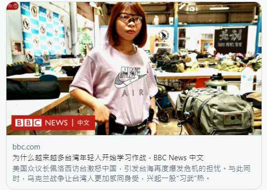 (圖:BBC中文網推特官方賬號) BBC這篇報道以其記者傅東飛(Rupert Wingfield-Hayes)為第一人稱,並在報道開頭就大肆“渲染”台灣問題,稱朋友得知他在台灣進行採訪任務,都擔心地表示,“我希望你有防彈衣”、“你住的飯店有防空洞嗎”,因為他們認為佩洛西的台灣之行注定會帶來非常糟糕的結局。 與此同時,傅東飛報道稱,最近在距離台北半小時車程的一家廢棄廠房中,觀摩了大約30名年輕男女學習基本射擊技能的過程。 他發現,雖然這些年輕人使用的是氣槍,但跟真槍幾乎一模一樣;且更高級的訓練班還會全副武裝,身穿防彈服、頭戴頭盔以及無線通信設備,在訓練營進行巷戰演練。 據訓練營的開辦者蔣先生(Max Chiang)透露,自從今年2月以來,參加槍支訓練的人數猛增了50%,某些訓練班的女生比例更達到40-50%。 此外,報道還採訪了幾位台灣政客,包括親綠的無黨籍“立委”林昶佐。 這位自己“閃兵”(逃兵役)卻到處喊戰的台灣政客,自俄烏開戰以來就不停“碰瓷”,藉機炒作台灣問題,這次也不例外。他對BBC說,“台灣人民支持加強防務力量,尤其年輕一代表現出保衛台灣的強烈願望”。