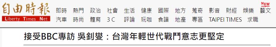 (圖:台灣“自由時報”) 值得一提的是,台灣當局外事部門負責人吳釗燮近日也接受了BBC同一位記者的採訪。在採訪中,吳釗燮同樣提到,台灣年輕世代似乎比上一代具有更堅定的戰鬥意志,並公然喊話其他國家“提供防禦性武器”。 事實上,美國眾議長佩洛西8月2日執意竄訪台灣地區,引發台海局勢緊張,“若開戰去哪避難”、“該不該上戰場”等,就成為島內網路熱議話題。台灣當局推出的APP“警政服務”,更因有防空避難處地圖與導航,下載量一度衝上排行榜第一名。 “戰鬥意志堅定卻不想當兵”、“年輕世代不想當一年兵”,對於BBC突然炒作“愈多台灣年輕人開始學習作戰”,台灣網友是哭笑不得,直言BBC對台灣年輕人是不是有什麼誤會,他們除了嘴砲厲害,還有貪生怕死不當兵。
