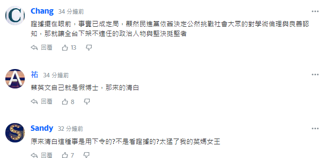 (台北市長柯文哲 中央社) 柯文哲指出,這問題不是今天才有,也不是只有林智堅一人,現在問題這麼大,台大自己要處理,但他看到民進黨的態度後,認為“現在民進黨已經不是他當年認識的民進黨”,批評民進黨為了一時的選舉勝敗,連台灣大學都要攻擊。 “我覺得這案子,到現在為止,只能用一個字形容,ugly(醜陋),”柯文哲還說:“人家開審查會,叫你來報告你又不來,人家報告出來,又在外面放炮”,整個台灣亂掉了。 畢業於台灣大學的台北市副市長黃珊珊則說,“從來沒有一天像昨天一樣這麼以台大為榮”,相信任何一個台大人都不會希望為任何一個特定人士,賠上台大的學術專業,這件事情就應該是由該負責的人,包括老師跟學生自己都要負責,“一直攻擊台灣大學,不會讓你的論文變成真的”。 不少島內網友也紛紛在網絡就此事留言, “(民進黨)囂張到極點”,“台灣最醜的風景是民進黨”,“民進黨變成沒有是非對錯,沒有正義公理,只剩自私”,“民進黨怎麼會變成今天這個樣子?完全沒有是非的政黨,醜陋至極。” 還有網友眼看台灣“九合一”選舉臨近,稱“這次一定要用選票來教訓這些騙子”,“只有柯文哲還醒著,民進黨集體裝睡,還在做夢騙選票”,“應該這麼說,民進黨為了選舉,沒有什麼是不能攻擊的.....” 至於蔡英文所謂“支持智堅繼續努力,相信同志清白”的言論,不少島內網友也紛紛炮轟:“證據擺在眼前,事實已成定局,顯然民進黨依舊決定公然挑戰社會大眾對學術倫理與良善的認知”,“以後審判不用看證據,一切民進黨說了算”,“蔡英文自己就是假博士,那(哪)來的清白?” “智堅的清白就跟乾淨的煤一樣。” 還有島內網友忍不住諷刺。