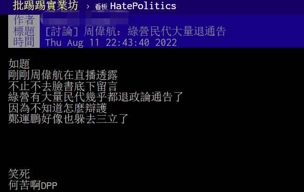 蔡英文臉書喊“挺堅”,但卻不見綠營人士相挺。 據台媒報道,台灣輔仁大學助理教授周偉航昨晚(8月11日)在個人平台直播提到林智堅論文案,更爆料民進黨的民意代表們“大規模退通告”。 周偉航爆料稱,民進黨的“民代”們不僅沒有到蔡英文和林智堅的臉書下面按讚,而且還大規模的退通告,“幾乎全部通告都在退”,目的就是不想上政論節目去幫林智堅辯護,因為“太難辯護了”。 周偉航更點名民進黨“立委”鄭運鵬“也龜縮起來”。 在直播中,面對觀眾提問,周偉航表示,鄭運鵬說有看林智堅的論文,但他也不確定,因為沒有碰到鄭運鵬,鄭運鵬最近都在“閃”(躲)其他人。 此前,針對蔡英文“挺堅”貼文,周偉航在節目《突發琪想》上曾指出,當初他開直播同時看林智堅的兩本論文,一個小時只看了9頁而已,若要看完兩本就需要一天以上,因此他認為民進黨人全部都沒有看完。 而最新直播片段流出後,有台灣網友在島內論壇PTT上以“周偉航:綠營民代大量退通告”為題發文,直呼“笑死,何苦啊?”。