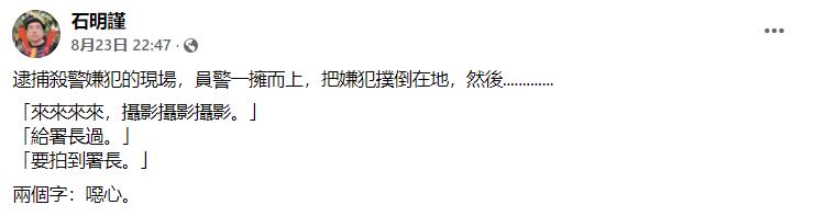 台南殺警案嫌犯落網,現場傳來一句:要拍到署長!香港新聞網8月25日電 台灣台南市22日發生一起嚴重殺警案,警方出動大批警力追捕,台灣內政部門警政署署長黃明昭也親自率隊逮人,最終嫌犯在逃亡17小時後落網,台媒紛紛報道“署長黃明昭親自坐鎮緝凶”。 不過,台媒現場畫面卻清楚拍到,數十名警員先將嫌犯壓制在地上,隨後警政署長滑著手機穿過人群,站在鏡頭前給嫌犯上銬,期間有人高喊“攝影攝影”、“給署長過一下”、“要拍到署長”……