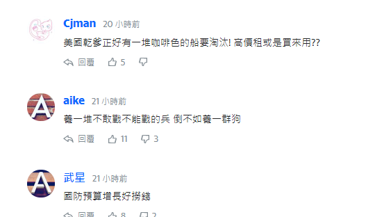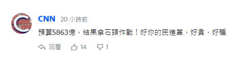 (圖源:中時新聞網) 台當局領導人蔡英文今日在社交媒體發文聲稱,明年度防務預算為史上最多的一次,面對大陸的軍演以及各種制裁,台灣當局應該做好完整應變的準備。她還說,明年度總預算有三個重要特色,還債最多;因為當局嚴守財政紀律,所以明年度編列還債預算為1110億元,是22年來最多。 此外,她說,社會福利最多;為了給全台更完善的支持與照顧,明年度所有支出中,編列最多的是社福照顧項目。尤其是少子化預算、長照預算、社宅租金補貼等項目,也都是史上最高!她亦表示,防務預算史上最多;就是希望提供台軍更寬裕的支持,強化軍事整備工作。 台灣防務部門對此表示,面對大陸近年不斷擴大針對性軍事活動,常態化運用軍艦、軍機,在台灣周邊海、空域進行軍演;台防務部門重點於持續推動機艦台造、提高裝備妥善、補充彈藥存量並提升後備戰力,發展不對稱作戰,以加速防務建設,建構可恃防衛力量,籲請島內民眾給予支持。 對於蔡英文的說明以及台防務部門的呼籲,島內民眾紛紛在相關網頁留言表示不解、無語以及憤怒。 有島內網友想到日前大陸無人機拍到金門崗哨、士兵丟石頭企圖驅離一事,留言嘲諷:“接敵時居然用石頭丟?石器時代的武器需要用到五千多億?這是我們的血汗錢。”“預算5863億,結果拿石頭作戰!好你的民進黨,好貪,好騙!”也有人對於台防務部門說將重點於持續推動機艦台造揶揄道“美國乾爹正好有一堆咖啡色的船要淘汰! 高價租或是買來用??”“只有你會不對稱作戰?大陸也可以用殲5,殲6神風特攻機,無人艇,跟你玩啊!”