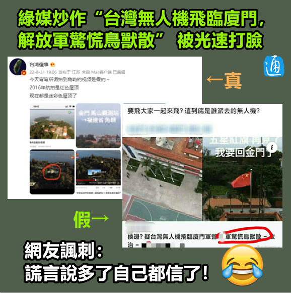 香港新聞網製圖 據綠媒報道,“長期關注武器發展”的粉絲專頁“IDF經國號”,近日在其臉書上傳了一段視頻短片。短片畫面顯示,一架無人機飛越一片樹林,來到一處掛有五星紅旗的軍營。字幕則顯示,這架無人機是從“金門縣馬山觀測站飛臨廈門市角嶼島的解放軍營區”。 報道還說,畫面中可以看到有十多名解放軍在室外集合,不過“解放軍發現有無人機偵測後,像是吃了一驚,突然鳥獸散”。 “IDF經國號”隨短片還附文:“不知道這段原始出處,反正‘(台灣)民用無人機’飛回去就對了。” 值得注意的是,綠媒這篇報道所取的標題是《換邊?疑台灣無人機飛臨廈門軍營,解放軍驚慌鳥獸散》,盡管在標題中用到了“疑”這個字以示“嚴謹”,但那種“終於扳回一局”的心情則再明顯不過。又或者是受到了“IDF經國號”那句“反正飛回去就對了”的“鼓舞”,“激動”到連基本的事實查證都懶得去做了。 “台獨”分子也跟著興奮起來,紛紛在評論區留言:“爽!”“以其人之道還治其人之身。”“(解放軍)連丟石頭的反抗都沒有。” 然而,綠媒和“台獨”分子還沒“爽”夠,就被大陸網友迅速用鐵的事實打臉了。 經大陸網友查證,這段所謂的“台灣無人機飛臨廈門”的視頻,其實是2016年發佈的一段航拍視頻。對比“央視軍事”8月22日發佈的最新一期視頻顯示,角嶼的軍營主樓顏色是迷彩綠,不是(該短片的)白色,屋頂顏色也從(短片中的)紅色變成了迷彩綠。 臉被打疼的綠媒,還不忘給自己“挽尊”,修改了相關報道,並在其臉書上承認:“要飛大家一起來飛?這到底是誰派去的無人機?答案揭曉,這應該是舊影片!” 【編輯:胡雪石】