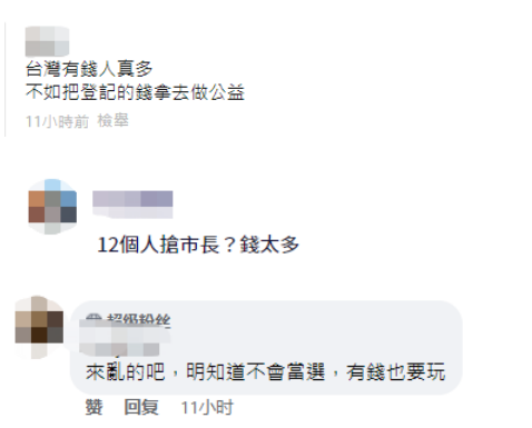 另外也有人表示,“台灣有錢人真多,不如把登記的錢拿去做公益。”“來亂的吧,明知道不會當選,有錢也要玩。”