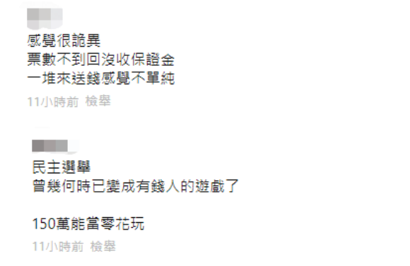 還有人稱,“感覺很詭異,票數不到會沒收保證金,一堆來送錢感覺不單純。”“民主選舉,曾幾何時已變成有錢人的遊戲了。”