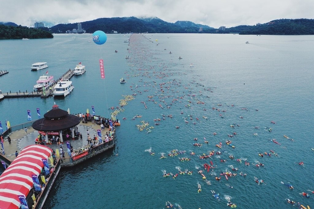 日月潭萬人泳渡活動4日登場。受台風影響,活動舉辦地出現大雨天氣,但近2萬名咏者不畏風雨下水。(香港新聞網9月5日綜合) 【編輯:施鑫岳】