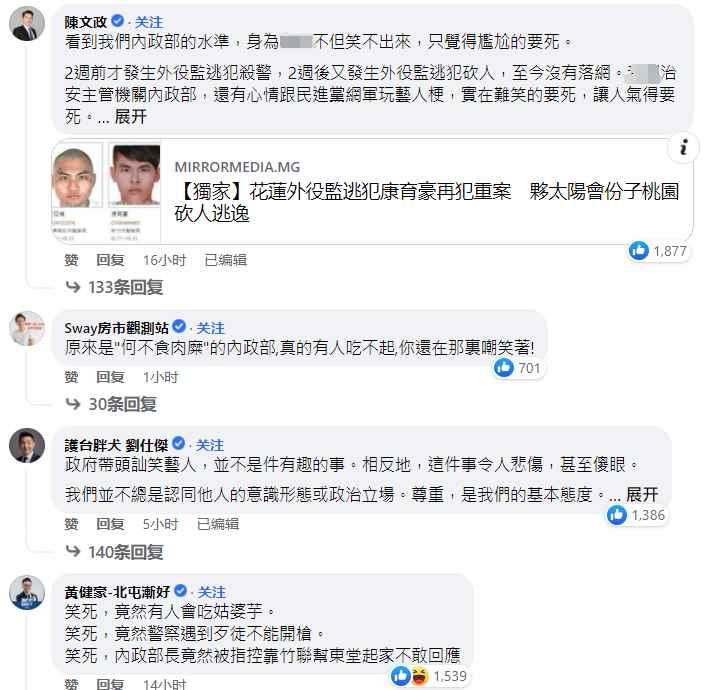 (圖:民進黨當局內政部門臉書賬號) 還有台灣網友在PTT論壇發文,質疑“民進黨當局可以這樣(用)‘笑死’偷酸民眾嗎?”並透露自己有點害怕,因為“連之前殺警的都沒被這樣對待”。
