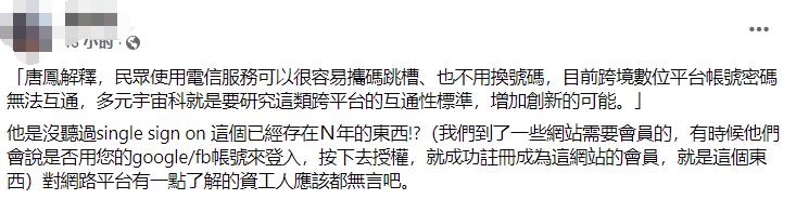 在臉書,有台灣網友開始給唐鳳科普起了“single sign on”(單一登入系統)”:一些網站需要會員登入,有時會詢問“是否用您的Google/臉書帳號來登入”,按下去授權,就成功註冊成為該網站的會員,“就是這個東西”,“已經存在N年”! 該網友說,唐鳳拿“攜碼免換號”解釋“多元宇宙科”,對網絡平台有一點瞭解的資工人(指資訊工程業者)應該都無言吧!