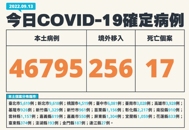 香港新聞網9月13日電 中秋連假剛過,台灣疫情再創新高…… 據台灣流行疫情指揮中心公布,截至9月13日零時零分,新增4萬6795例本土個案,確診個案新增中重症56例(中症39例、重症17例),其中17人死亡;另外,境外輸入新增256例。