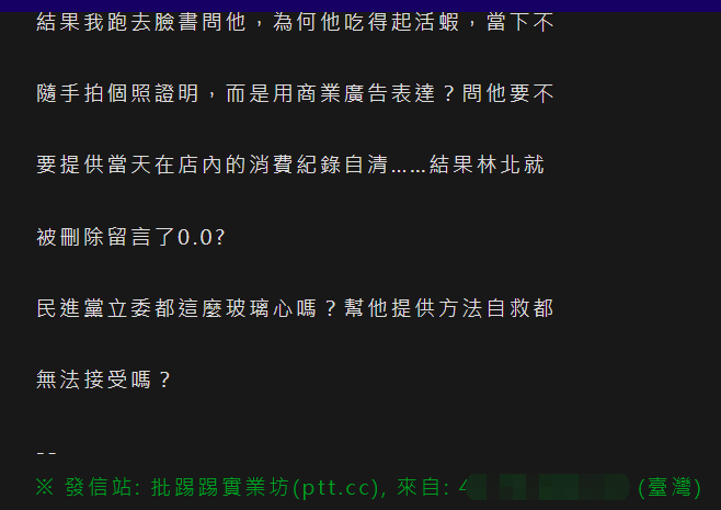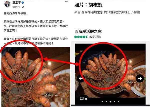 近日,因在大陸節目提到“小時候家境不好,沒怎麼吃過海鮮”,台灣藝人楊丞琳慘遭島內綠營圍攻,指責楊丞琳刻意貶低台灣。此外,綠營及其支持者還在臉書曬出一張張海鮮打卡照,表示在台灣吃海鮮是很平常的事。 結果,有台灣網友發現,這些海鮮打卡照,大多都是“盜版貨”! 在陳時中爆出“盜圖”爭議後,台灣護理師張喬瑜發文質疑,民進黨“立委”王定宇為了嘲諷藝人楊丞琳“海鮮事件”而貼出的胡椒蝦圖片,竟然跟某店家圖片一模一樣,直呼“又是一個盜圖仔”、“笑死,民進黨整組怎麼了?” 台灣媒體人張禹宣也在臉書爆出,王定宇怕被抓包,還刻意地先用截圖,再截掉邊角變成正方形,讓畫質明顯變得模糊,以此規避GOOGLE圖片搜尋。 張禹宣諷刺,王定宇愛吃海鮮,想要“抗中保台”修理藝人,竟然連出門買隻蝦都懶。 對此,王定宇先是發文駁斥,表示他第一句就有註明出處,並強調這個照片是胡椒蝦店家的商業廣告照,本來就是要廣發宣傳用的,也已經獲得店家授權使用,怒嗆有些記者“小時候不讀書嗎?” 不料,該帖文剛發出不久,就有不少熱心網友在評論區踢爆,這張海鮮照其實是一位遊客拍攝、並分享在旅遊網站的。 還有台灣網友表示,如果王定宇要澄清,最好辦法是提供當天在店內的消費記錄。但是,這個留言卻被刪除了,氣得他跑到PTT發文“民進黨‘立委’都這麼玻璃心嗎?”