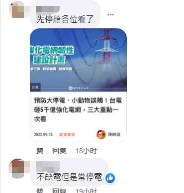 (圖:台灣電力公司) 台電表示,該計畫一大重點,是通過“電廠直供園區、幹線留給民生”的分散工程降低電網集中風險,未來除可降低大規模停電發生幾率,即使發生類似突發事故,也可大幅限縮影響範圍、縮短復電時間,提升大眾民生用電品質。 雖然台電說了一大堆分散式電網好處,但有台灣網友卻不認同,認為台灣頻繁停電的根本原因是缺電,相關計畫卻看不到有針對性措施,質疑以後停電都是分區停,而且是民生用電先停,“電廠直供”的園區最後。 台北發生停電事故後,更有台灣網友調侃“先停給各位看了”、“真的笑死”。