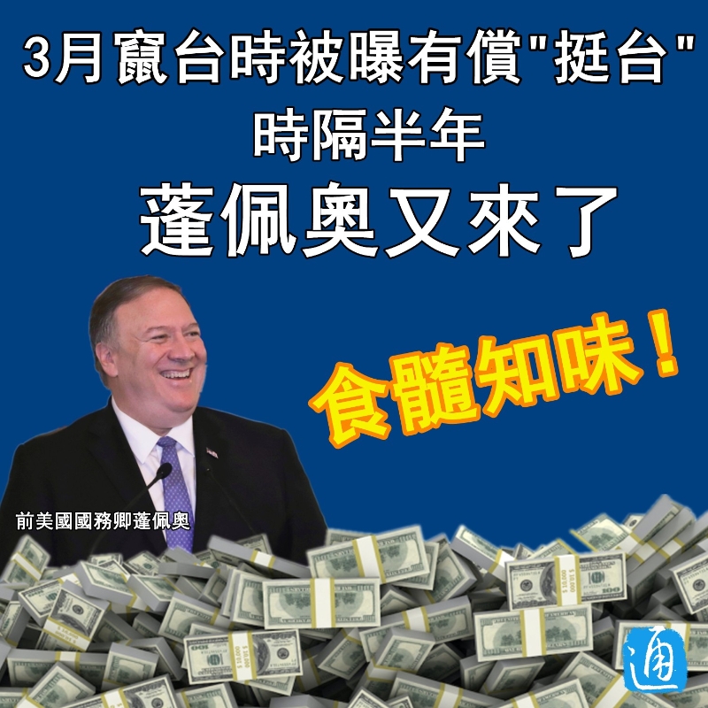 香港新聞網9月27日電 繼今年3月高調竄台後,前美國國務卿蓬佩奧26日打著“挺台”的旗號再度竄訪中國台灣地區。上次蓬佩奧剛離台,島內就有媒體爆料稱,蓬佩奧所謂的“挺台”是明碼實價的,不僅全程花銷都由民進黨當局買單,而且另有15萬美元輕鬆入賬,可謂“又吃又拿”。 對於蓬佩奧這一趟的到來,島內網民紛紛表示:這是食髓知味啊……