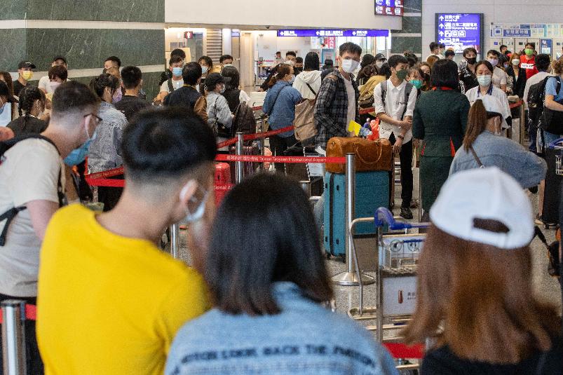 圖為台灣桃園機場旅客排隊過安檢。 香港中通社圖片 新增44665例本土病例,年齡介於未滿5歲至90多歲以上,病例分布以新北市9170例,台中市5879例,台北市4961例,桃園市4832例為多。 新增53例本土死亡病例,年齡介於10多歲至90多歲以上,皆屬重度感染、47例具慢性病史、31例未接種3劑以上新冠肺炎疫苗。 當局衛福主管部門當天宣佈,將於10月13日起,放寬入境人員免居家檢疫,改採7天自主防疫,自主防疫期間持有2日內快篩陰性結果者,可以外出、上班上學,但必須全程戴口罩。 據指揮中心統計,截至目前全台累計641萬7941例確診新冠肺炎,其中638萬3221例為本土病例,死亡病例累計11003例。(完) 【編輯:胡雪石】