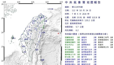 香港中通社10月11日電 台北消息:台灣花蓮外海11日清晨發生規模5.9地震。當局氣象部門地震測報中心表示,該地區規模5.5以上的地震發生頻率高於往年,但此次地震餘震發生不超過2天。