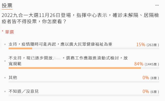 圖片來源:社交媒體截圖 台灣世新大學客座教授王健壯亦就此事發聲,直言自詡“民主”的台灣,讓隔離者、確診者投票是台當局的責任,“好奇”韓國既然可以在疫情中投票,台灣難道不能有樣學樣嗎? 此外,台灣“聯合新聞網”發起的“2022九合一大選11月26日登場,‘指揮中心’表示,確診未解隔、居隔檢疫者皆不得投票,你怎麼看?”的投票顯示,84%的島內民眾反對確診者以及居隔檢疫者不能投票這一決議。