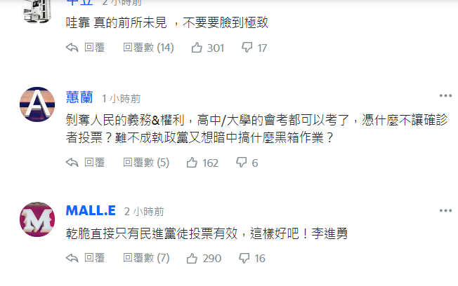 製圖:汪彥希 中國國民黨“立委”鄭麗文質疑,過去2年疫情嚴重的時候,美國都辦過總統大選,而多數國家及地區都沒有因為確診者而不能投票,美國CDC也表明因為確診被隔離的人,不能被阻擋行駛投票權,認為台灣有關做法太落後。 民進黨“立委”羅美玲質詢時也提及,曾建議可參考韓國作法,以分流、分時段的方式讓確診者出門投票。對此,李進勇則說,不管在“法令”上、選務實務上都無法克服,結論是確診者無法出來投票。 李進勇回應稱,根據“傳染病防治法”規定,確診就必須接受隔離,且“司法院”大法官釋字第690號解釋也認為,確診隔離就不能出門投票一事“沒有違反‘憲法’”,聲稱這是不得已的事情,但還是要按照台灣防疫措施施行。 至於民眾可能會為了投票隱匿確診,李進勇坦言,"中選會"確實無法清查跟掌握,希望大家按照防疫措施走;對於被質疑剝奪島內民眾投票權,李進勇仍強稱"中選會"沒有沒收投票權,是因應傳染病防治法對確診者有所限制,不是剝奪投票權。 李進勇還說,有些人建議應為確診者特別安排投票所,也有人說可延長投票時間到下午5時,讓確診者投票。但"中選會"邀集防疫機關、“內政部”、“交通部”等開會協調,結果是真的有困難、無法克服。又稱延長時間也有困難,希望確診者按照台灣防疫相關規定來配合辦理。 台當局動輒把“民主自由”掛在口邊,如今卻“言行不一”……這引發不少台民眾憤怒及反感! 有網友表示,“台灣民主是笑話,健康才有投票權……”亦有人質疑,確診者在有條件下可以出門,但不能投票?如果按李進勇的“有傳染病不能投票”的邏輯,流感也是傳染病……唉啊,一堆人都不能投票。 “乾脆直接只有民進黨徒投票有效,這樣好吧!”還有網友諷刺道。 也有島內民眾提出,為什麼高中、大學的會考確診者、隔離者都可以考了,憑什麼不能投票?“難不成執政黨(民進黨)又想搞什麼黑箱作業?”