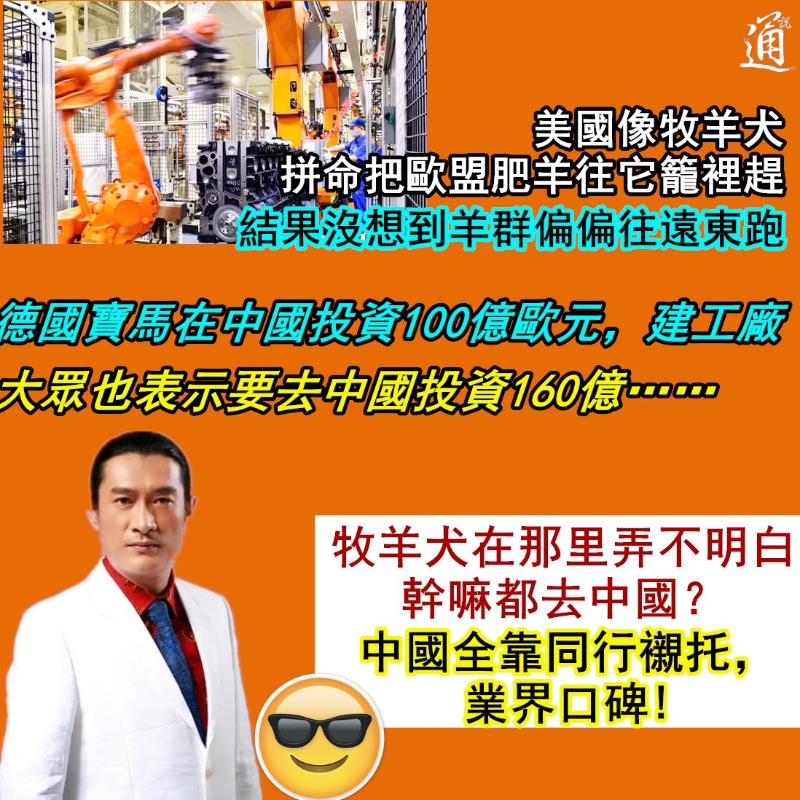 香港新聞網10月24日電 台灣藝人黃安在社交媒體發文稱,美國就像牧羊犬,拼命把歐盟肥羊往它的籠子裡趕,結果沒想到羊群偏偏往遠東跑:德國寶馬公司在中國投資100億歐元,建電池工廠;大眾(福斯汽車)公司也表示要去中國投資160億;德國總理舒爾茨表示,要率領德國商團於11月訪問中國,洽談各種合作合約。 法國總統馬克龍大熱天穿著毛衣,告訴法國人天氣冷,穿多一點,咬咬牙就過去了。馬克龍本意是想振興法國紡織業,結果振興了浙江濮院兄弟。濮院作為世界最大的羊毛衫批發市場,今年1-9月交易量560億,歐洲秋衣秋褲訂貨量直接翻了4倍。 牧羊犬在那里弄不明白,幹嘛都去中國? 他直指,全靠同行襯托,業界口碑,感謝感謝。
